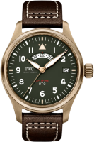 Часы IWC из коллекции Pilot's. Классические мужские часы IWC Pilot's Watch UTC Spitfire Edition MJ271 41mm IW327101 премиального качества (Артикул магазина: IW-0529) оснащены надежным автоматическим механизмом с автоподзаводом (работает от амплитуды движения руки) калибра ETA2836-2, в котором реализованы следующие функции: часовая, минутная и секундная стрелки, а так же дата. Круглый корпус часов бронзового цвета, имеющий размер 41 мм и высоту 14.1 мм превосходно дополнит образ и украсит запястье своего обладателя. Для изготовления часов IWC Pilot's Watch UTC Spitfire Edition MJ271 41mm IW327101 предлагаемых в нашем интернет-магазине, применяются бронза высокого качества (Швейцарский стандарт), а так же сапфировое стекло высокой прочности, благодаря чему обеспечивается максимальная защита от сколов и механических повреждений. Отличительной чертой данной модели является зеленый циферблат, часовые индексы которого обеспечивают арабские цифры. Завершает образ кожаный ремешок коричневого цвета с фирменной классической застежкой IWC. Водонепроницаемость данной модели составляет 30М (WR30) – допускается минимальное воздействие с водой.Для покупки товара в нашем интернет-магазине выберите понравившийся товар и добавьте его в корзину. Далее перейдите в Корзину и нажмите на «Оформить заказ» или «Быстрый заказ».